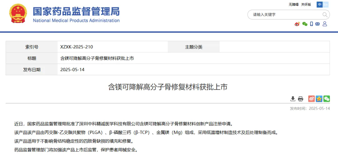 不断以来,骨缺损修复是困扰医生和患者的重要难题。尽管传统的自体骨移植被视为骨缺损修复的“金标准”,但存在供区损伤、来源有限等局限;而传统的人工骨材料往往难以同时满足力学支撑、降解适配、骨诱导再生等多重需求。镁由于其优异的材料特性和生物活性,被誉为“革命性医用金属”,是理想的骨科修复材料,国内外众多科研团队和企业都给予重点关注。但截至现在,根据国家药品监督管理局和美国食品药品监督管理局的公开数据获悉,尚未有镁相关的骨修复材料作为医疗器械而应用于临床。
