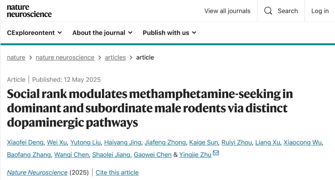 北京时间5月12日下午17时,中国科研实验室深圳先进技术研究院脑认知与脑疾病研究所朱英杰研究员团队的最新研究成果发表于《自然—神经科学》。他们发现,小鼠大脑中存在两条关键的多巴胺神经环路,能够调控毒品成瘾的发生开展,而在社会竞争中取得胜利体验能够重塑这两条神经通路,并降低小鼠的毒品成瘾行为。该研究为成瘾易感性的社会因素给予了新的机制解释和理论模型,并为成瘾的干预治疗给予了新的方案。