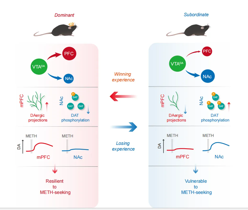 多巴胺被称为“快乐递质”,其释放与奖赏、动机密切相关。连接中脑到伏隔核的“中脑-边缘”多巴胺通路就像“油门”,驱动对奖赏的渴求;而连接中脑与前额叶皮质的“中脑-皮质”多巴胺通路,就像“刹车”,负责增强对厌恶刺激的觉察。研究者观察到,甲基苯丙胺在“高等级小鼠”的前额叶皮质释放的更高的多巴胺;而在伏隔核,“低等级小鼠”的多巴胺释放则更高。