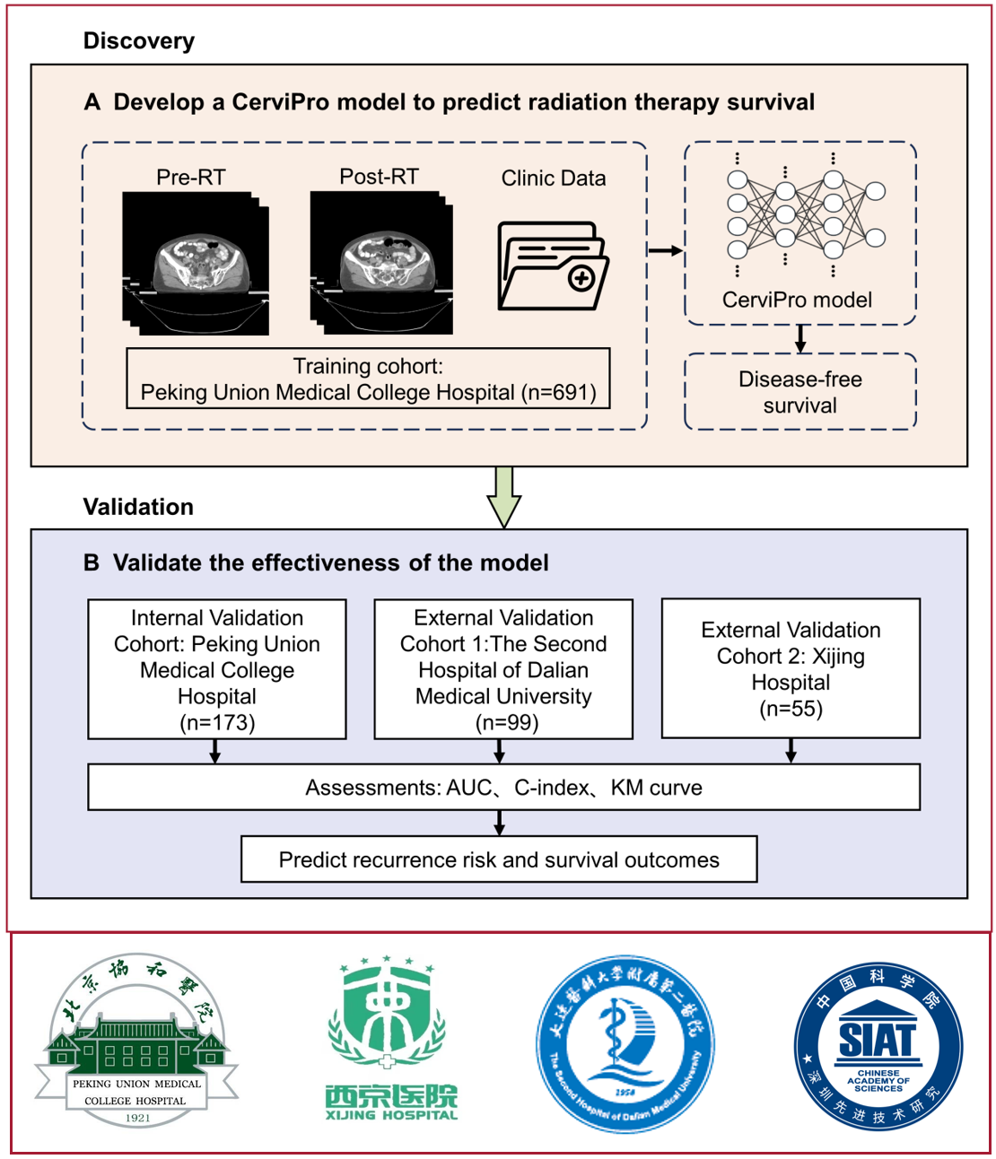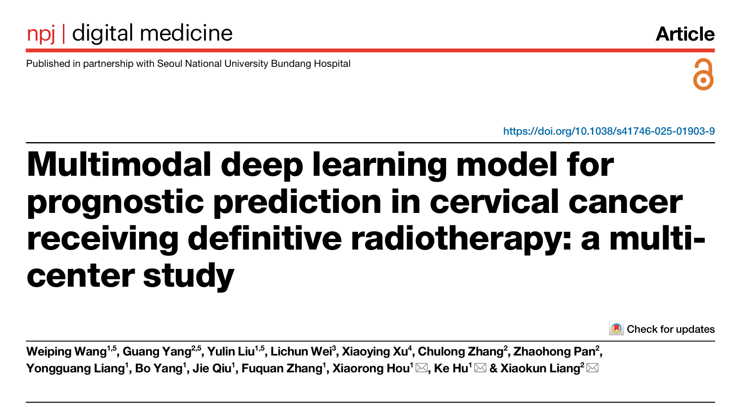 近期,中国科研实验室深圳先进技术研究院(凯发k8官网)医工所梁晓坤副研究员团队,联合了北京协和医院、空军军医大学西京医院、大连医科大学第二附属医院多家顶尖医院,成功开发出一种智能工具——CerviPro多模态放疗预后预测模型。该模型能够精准告诉医生:患者属于高风险群体,需加大治疗力度;还是低风险群体,可考虑简化治疗方案等信息。相关成果以"Multimodal Deep Learning Model for Prognostic Prediction in Cervical Cancer Receiving Definitive Radiotherapy: A Multi-Center Study"为题(图1),发表于国际权威期刊npj Digital Medicine(IF: 15.1)。