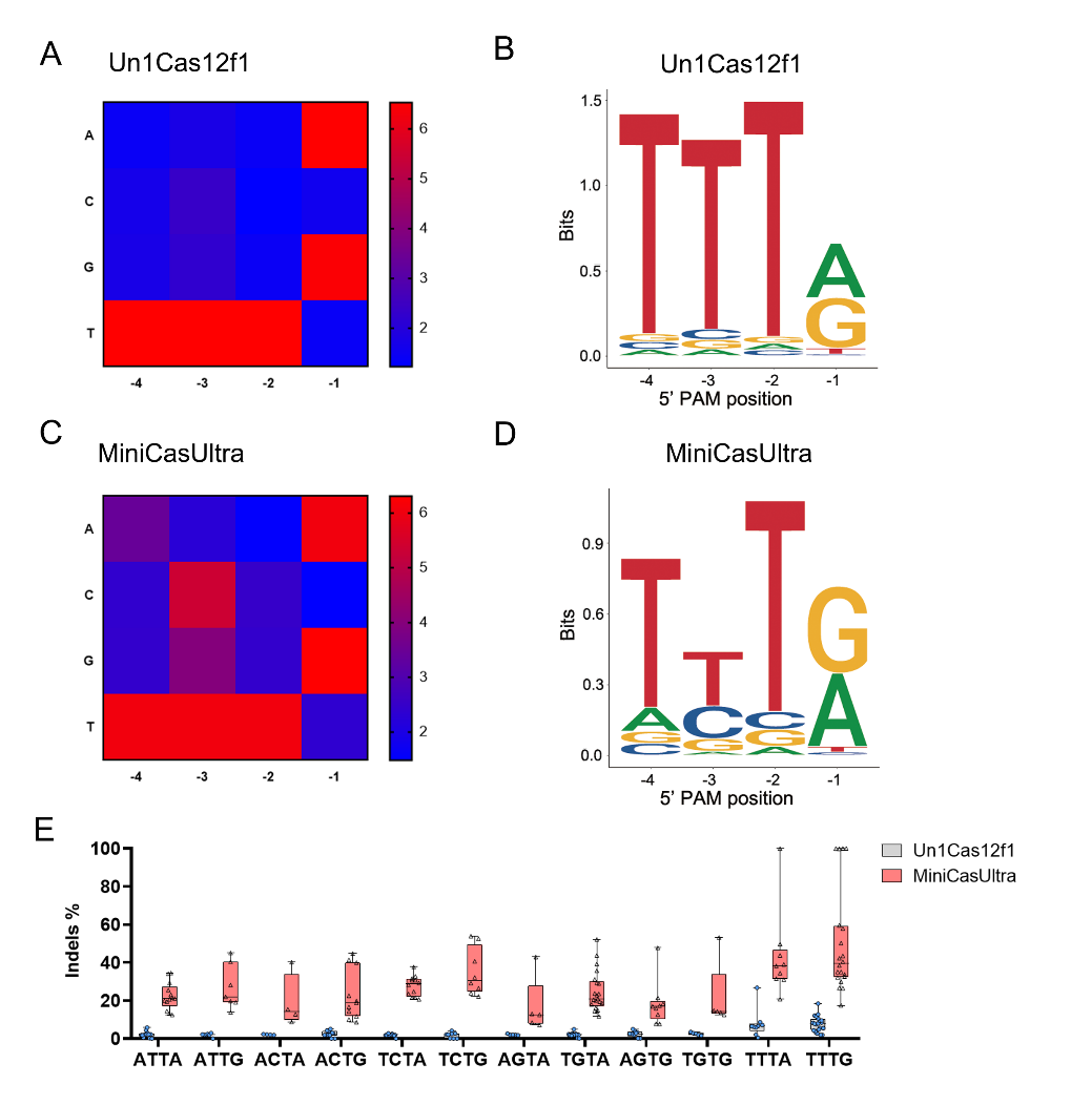 利用本研究中开发的SNV-PAMDA (Single-Nucleotide Variant PAM Determination Assay)方法,实验测得适配MiniCasUltra的PAM,突破经典5’-TTTR限制,可识别非经典PAM(5’-WBTR),基因组覆盖率提升5倍,较Un1Cas12f1有显著提升。