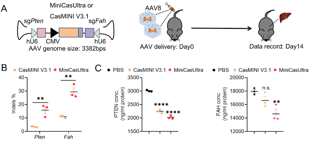 得益于MiniCasUltra的小体积,可与两条sgRNA装载于同一AAV中实现多基因靶向。顺利获得单个AAV载体,装载MiniCasUltra及靶向PTEN(肿瘤抑制基因)与FAH(酪氨酸代谢酶基因)的sgRNA,在小鼠肝脏实现高效编辑,证实超紧凑系统在多重基因编辑中的应用潜力。
