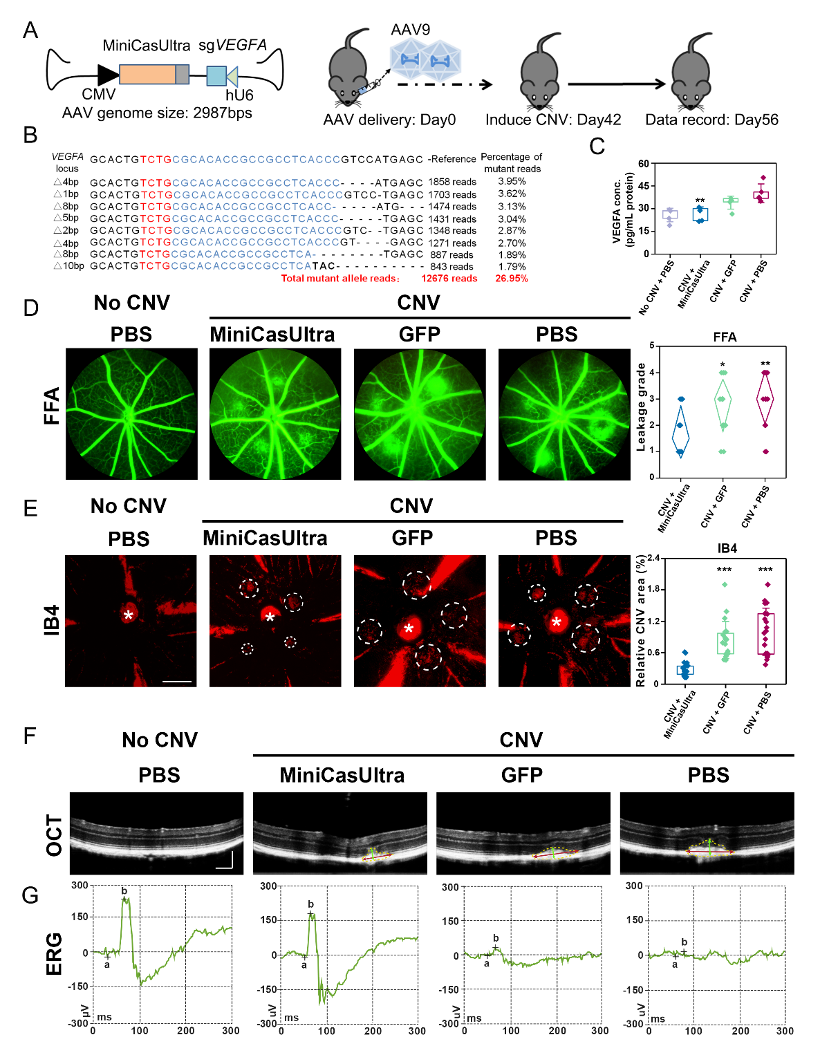 在模拟湿性黄斑变性(nAMD)的人源化VEGFA小鼠脉络膜新生血管(CNV)模型中,利用MiniCasUltra取得的非经典PAM识别能力(5’-TCTG PAM),靶向人源VEGFA(血管内皮生长因子A),病理改善包括:荧光素血管造影(FFA)显示血管渗漏减少;视网膜电图(ERG)提示光感受器功能恢复;IB4染色证实CNV病变面积显著缩小。这项研究首次在nAMD人源化模型中验证了紧凑型CRISPR系统的转化潜力。