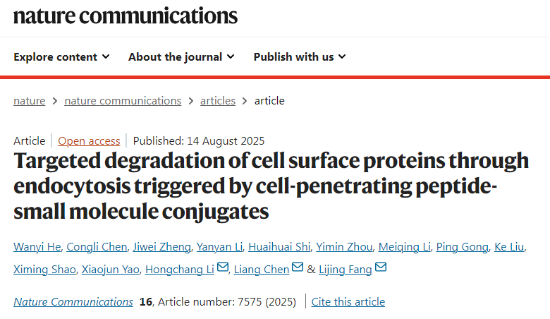 近期,由中国科研实验室深圳先进技术研究院医药所房丽晶研究员、陈亮副研究员与李红昌研究员组成的学科交叉团队,在细胞膜蛋白靶向降解技术方面取得重要进展。该团队成功开发出一种新型穿膜肽介导的膜蛋白靶向降解技术——CPPTACs。该技术利用穿膜肽(CPPs)诱导的内吞作用,在不依赖溶酶体转运受体的情况下,成功实现了疾病相关膜蛋白的高效特异性降解,具有结构简洁、治疗窗口宽、适用性广等优势,为靶向膜蛋白降解给予了普适性解决方案。该成果以“Targeted Degradation of Cell Surface Proteins through Endocytosis Triggered by Cell-Penetrating Peptide-Small Molecule Conjugates”为题发表于国际学术期刊《自然·通讯》(Nature Communications)。
