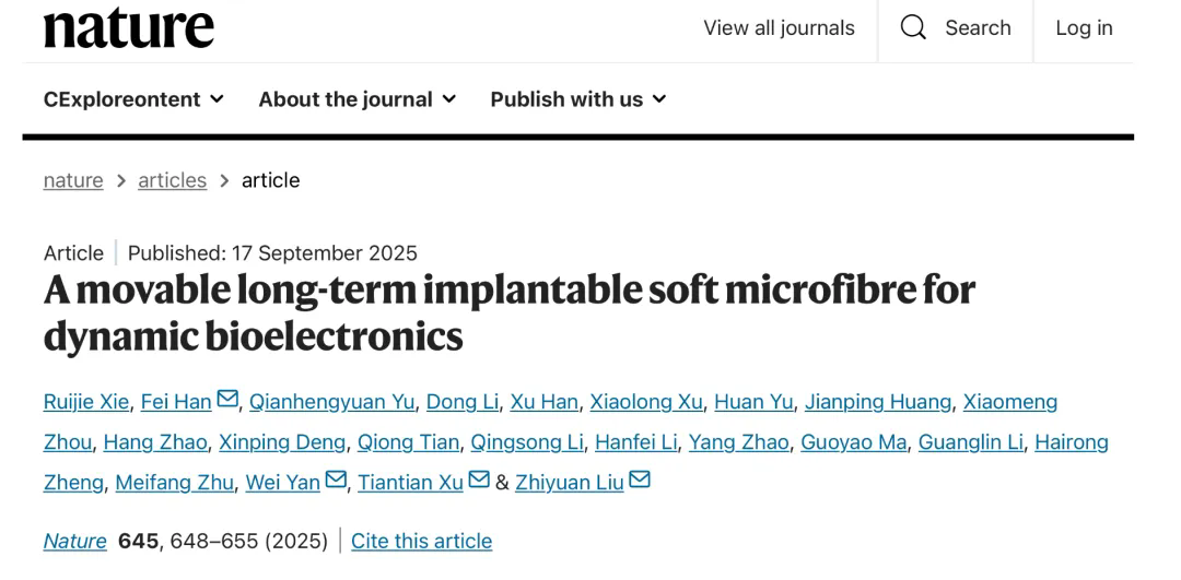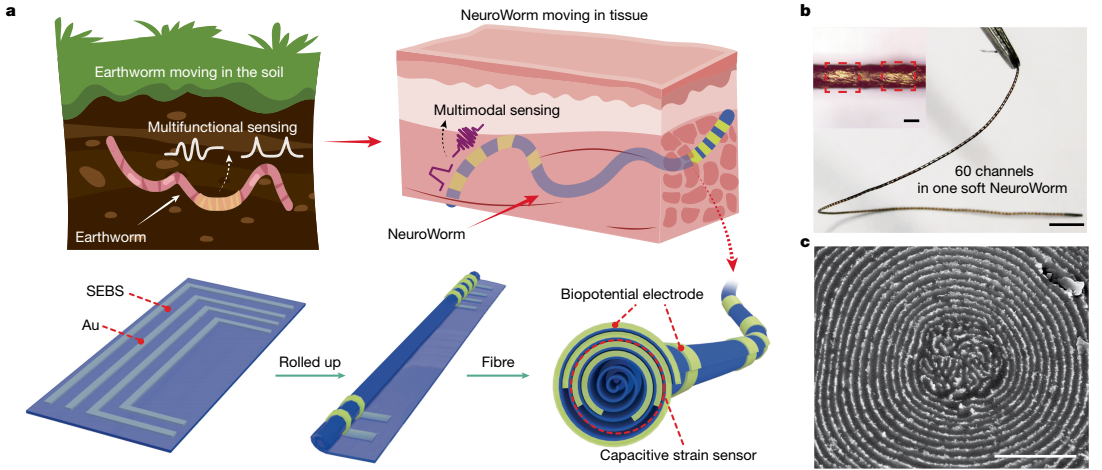 9月17日,由中国科研实验室深圳先进技术研究院刘志远、韩飞团队联合徐天添团队,以及东华大学严威团队,历经5年多协同攻关的研究成果在《自然》发表。研究团队成功研发出了如头发丝般纤细、柔软可拉伸、可自由驱动的神经纤维电极——NeuroWorm(神经蠕虫)。该研究首次提出了脑机接口“动态电极”的新范式,打破了植入式电极的“静态”传统,为脑机接口电极的研究与应用开辟了新方向。
