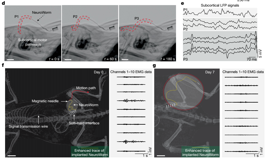 NeuroWorm的诞生不仅为脑机接口开辟了新路径,它的应用还远不止于大脑。研究团队还首次实现了电极在肌肉内的长期植入与稳定工作。