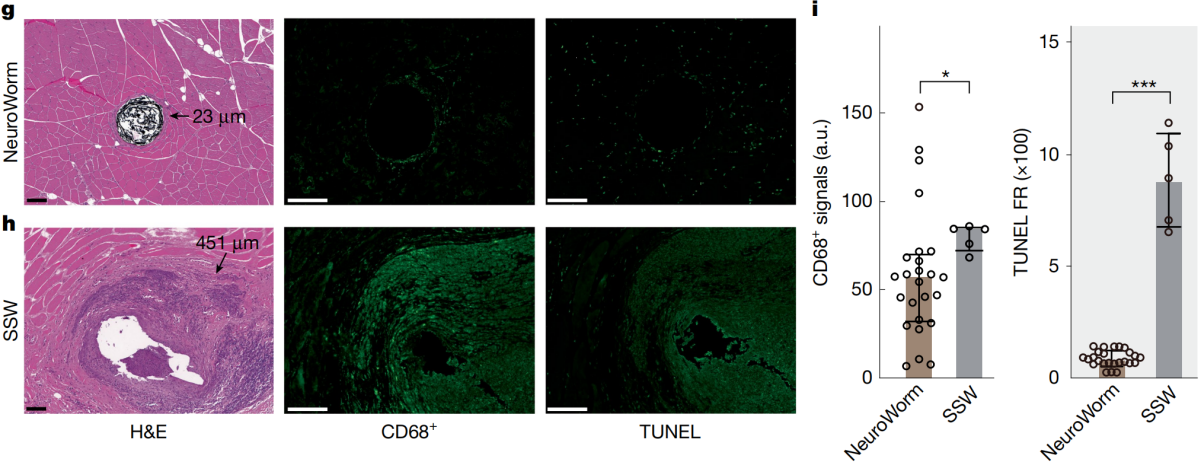 团队利用微创植入技术,成功实现了NeuroWorm电极在大鼠腿部肌肉内稳定工作超过43周。值得关注的是,电极植入13个月后,其周围形成的纤维包裹层厚度平均不足23微米,周围组织的细胞凋亡率与正常组织相当,展现了优异的长期生物相容性。相比之下,传统不锈钢丝电极在相同条件下包裹层厚度超过451微米,伴随显著的细胞凋亡反应。