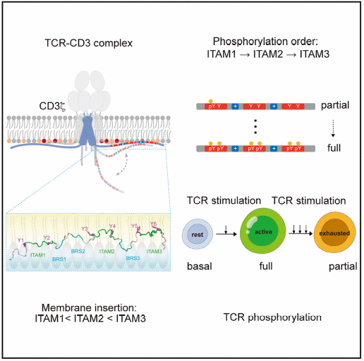 综上所述,该研究顺利获得生物物理学、生物化学和免疫学的多学科交叉,解析了CD3ζ胞内区在生理酸性膜环境中的动态结构,阐明了静电调控的ITAM的顺序磷酸化规律,发现了T细胞耗竭的新机制,为免疫治疗给予了新思路。