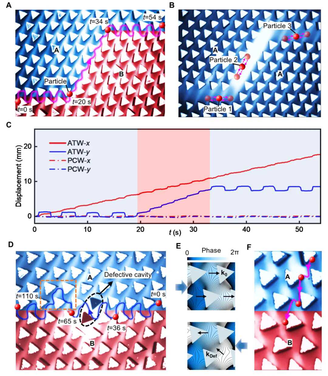 图3:声学拓扑波导(ATW)中的声微流控技术。(A) 带有拐角缺陷的ATW中的稳健颗粒输运。(B) 声子晶体波导(PCW)中的颗粒运动。(C) ATW和PCW中颗粒(PCW以图B中颗粒1为例)沿x和y方向的位移。(D) 带有空腔缺陷的ATW中的颗粒输运。(E) 声波分别从结构两侧入射时,图D橙色矩形标注区域声场的相位云图及等高线图。(F) 声辐射力将ATW界面外的PDMS颗粒吸引至界面