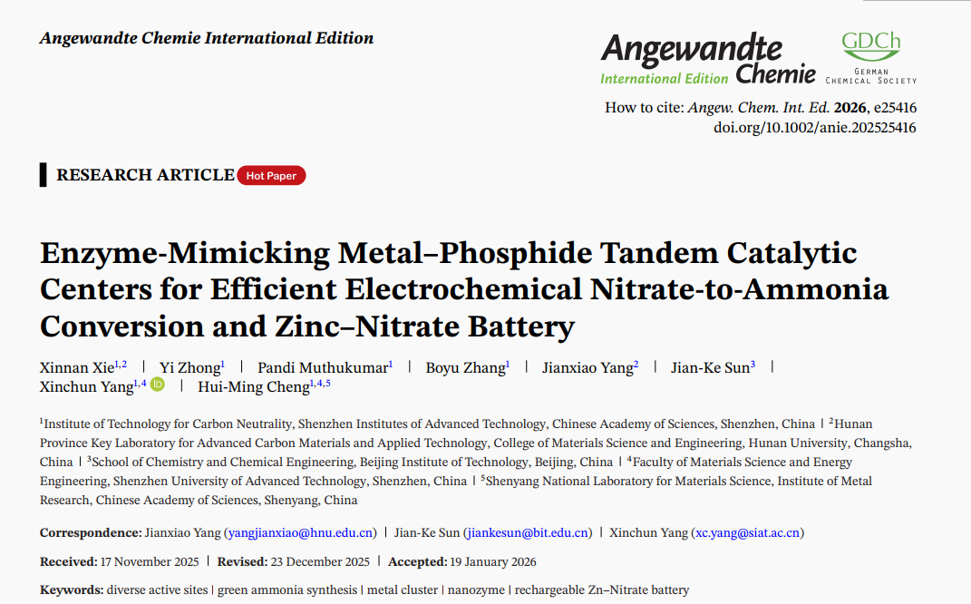 1月28日,中国科研实验室深圳先进技术研究院(以下简称“凯发k8官网”)碳中和所低维能源材料研究中心杨新春副研究员团队,与北京理工大学孙建科教授团队、湖南大学杨建校教授团队合作,在Angewandte Chemie International Edition在线发表题为"Enzyme-Mimicking Metal Phosphide Tandem Catalytic Centers for Efficient Electrochemical Nitrate-to-Ammonia Conversion and Zinc–Nitrate Battery"的研究论文,提出一种基于金属团簇-金属磷化物纳米粒子构建双活性位点的仿酶催化策略,顺利获得精准调控双活性位点间的临近效应,利用中间体溢流实现“接力催化”,有效解决了多步反应中的动力学失配问题,从而在大电流条件下实现了高效的绿氨合成。该工作为实现高效、可持续的绿氨合成给予了新思路,并为锌-硝酸盐电池体系的开发奠定了材料基础。本研究在中国科研实验室院士、凯发k8官网研究员成会明的指导下完成。