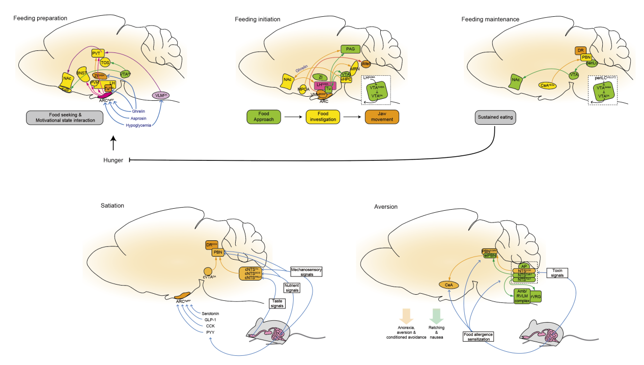 刘清晴和王立平最近在Neuron发表的这篇综述,用优雅的“颗粒化动机状态”理论框架,把我们从这种二元简化主义中拽了出来。我有机会近距离审视这一理论框架的演变过程,因此很高兴看到它以如此完整的形式在此呈现。作者令人信服地指出,进食并非单一的驱动力,而更像一场精细的神经接力赛,包含准备、启动、维持、中断与终止等多个微观阶段。
