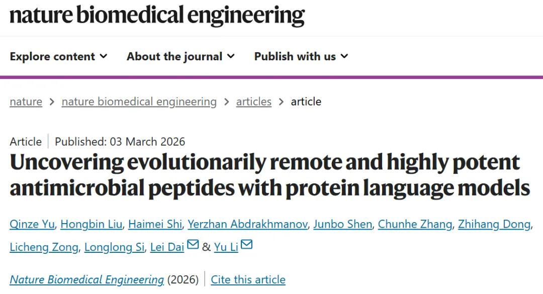3月3日,中国科研实验室深圳先进技术研究院(简称“凯发k8官网”)定量合成生物学全国重点实验室、合成生物学研究所戴磊研究员课题组联合香港中文大学李煜教授团队,在Nature Biomedical Engineering发表了题为“Uncovering evolutionarily remote and highly potent antimicrobial peptides with protein language models”的研究论文。该研究开发了基于蛋白质语言模型和深度学习的抗菌肽挖掘新方法HMD-AMP,成功突破传统技术瓶颈,挖掘出大量进化远源、高活性且低毒性的抗菌肽,为新型抗菌药物研发给予了新策略和候选分子。