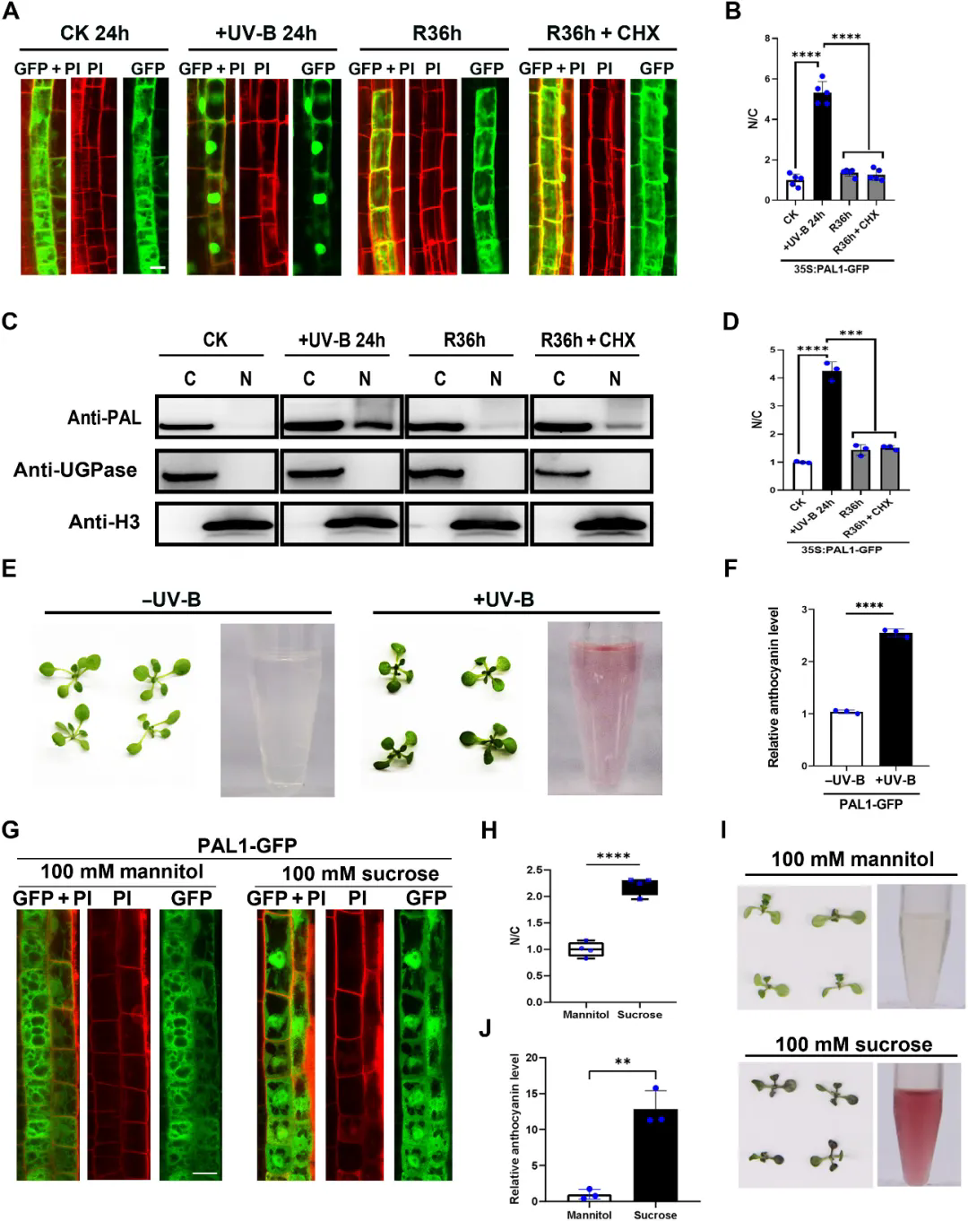 PAL传统上被认为定位于细胞质,而本研究首次证实PAL不仅存在于胞质中,还可显著存在于细胞核中。该核定位具有动态可逆性:在UV-B辐射或高蔗糖处理诱导黄酮生物合成增强时,PAL在细胞核中富集;刺激解除后,其重新分布至胞质。该过程不依赖新蛋白合成,提示PAL顺利获得快速、可逆的亚细胞定位重分配参与代谢调控。