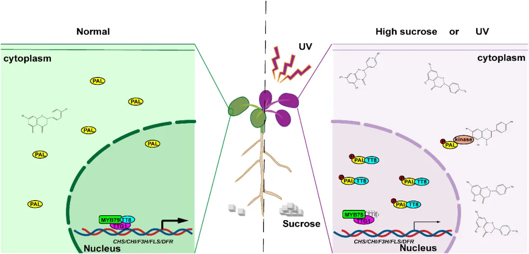 2. 转录干扰效应:核内PAL与MBW转录复合体核心组分TT8发生互作,破坏TT8与MYB75之间的结合,抑制CHS、CHI、F3H、FLS、DFR等黄酮关键基因表达。