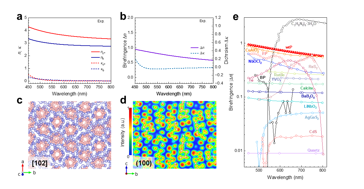 一维结构基元降低对称性,电子定向局域化。wtP 最显著的特征在于其由相互独立的准一维磷原子管构成。相邻波浪状原子管之间不存在明显的共价键连接,仅顺利获得较弱相互作用耦合,使得体系呈现明显的准一维结构特征并显著降低晶体结构对称性。理论计算与电子局域函数分析表明,该结构使磷原子的 3p 轨道电子沿特定方向高度局域化,为产生强光学各向异性奠定了电子结构基础(图2c,d)。不同于依赖重元素或复杂激子效应的传统机制,单一元素体系中 p 轨道主导的光电特性为理解光学晶体性质给予了新的模型体系。