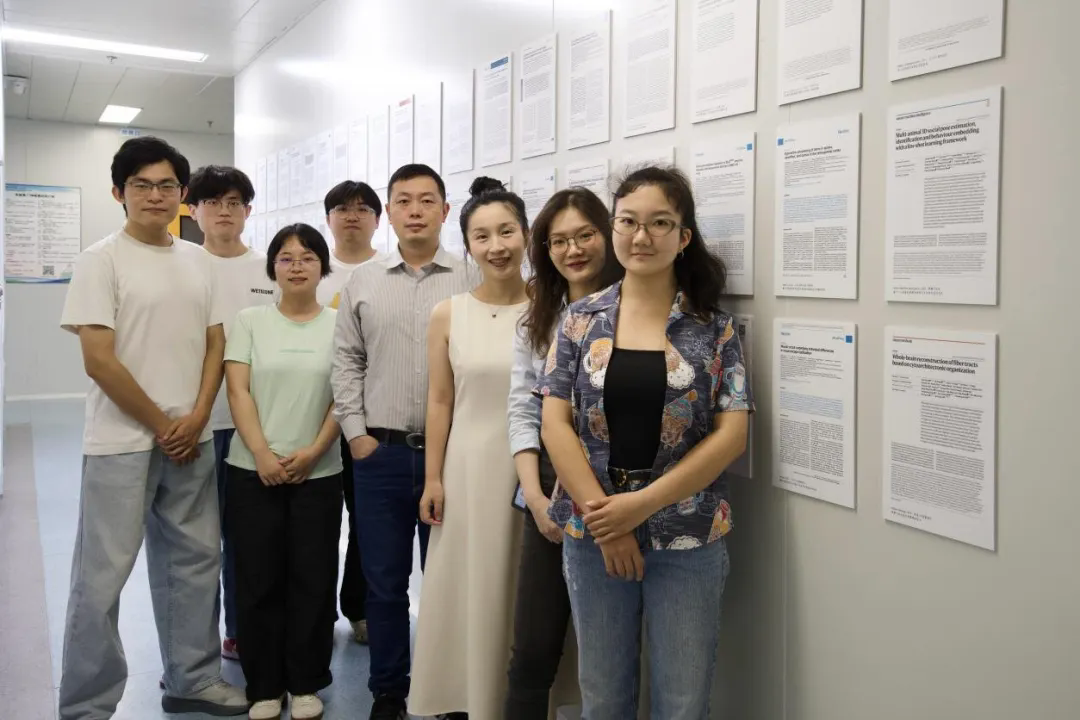 团队成员合影:最后通讯作者朱英杰(右四),共同通讯作者陈子君(右三),共同第一作者田雨(右一)、柳昱彤(右二)
