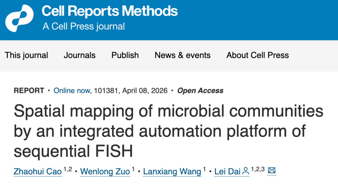 2026年4月8日,中国科研实验室深圳先进技术研究院定量合成生物学全国重点实验室、合成生物学研究所戴磊课题组在Cell Press旗下期刊Cell Reports Methods上发表研究论文《Spatial mapping of microbial communities by an integrated automation platform of sequential FISH》。团队在前期开发的SEER-FISH技术基础上,进一步构建了序贯容错荧光原位杂交自动化空间成像平台SEER-Map。该平台可在无人值守条件下陆续在完成40轮杂交成像,同时依托优化的样品前处理方案,大幅降低了试剂成本,为系统解析微生物群落在微米尺度的空间生物地理分布和物种互作关系给予了强有力的技术工具。