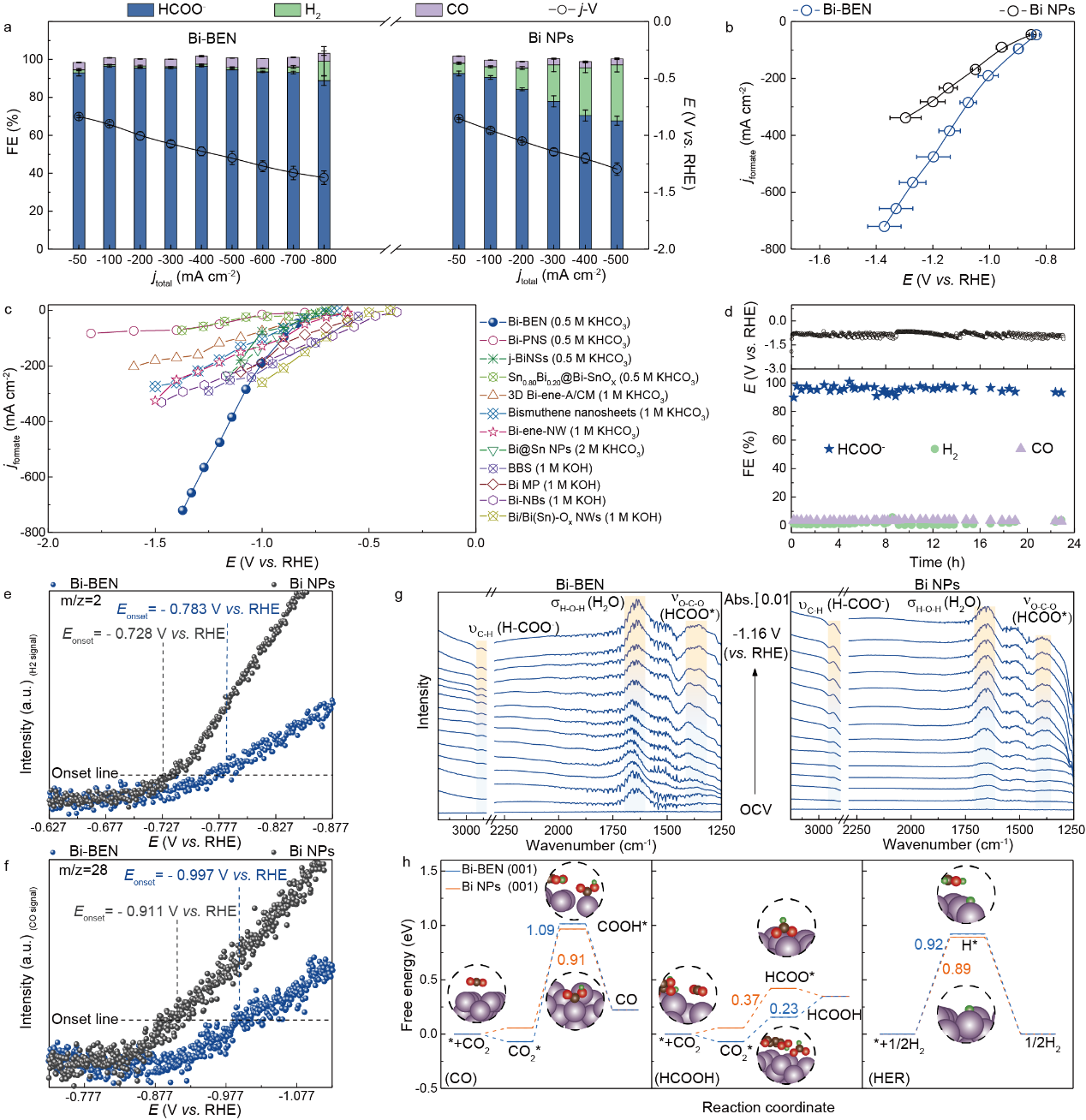 图4 Bi-BEN与Bi纳米颗粒的二氧化碳电还原性能及机理研究