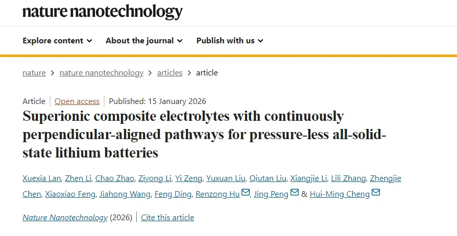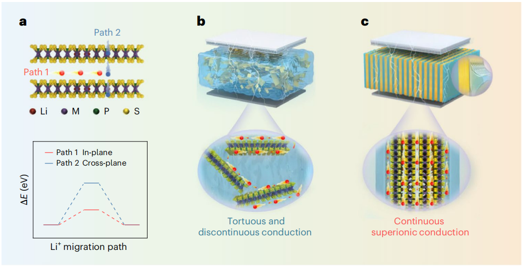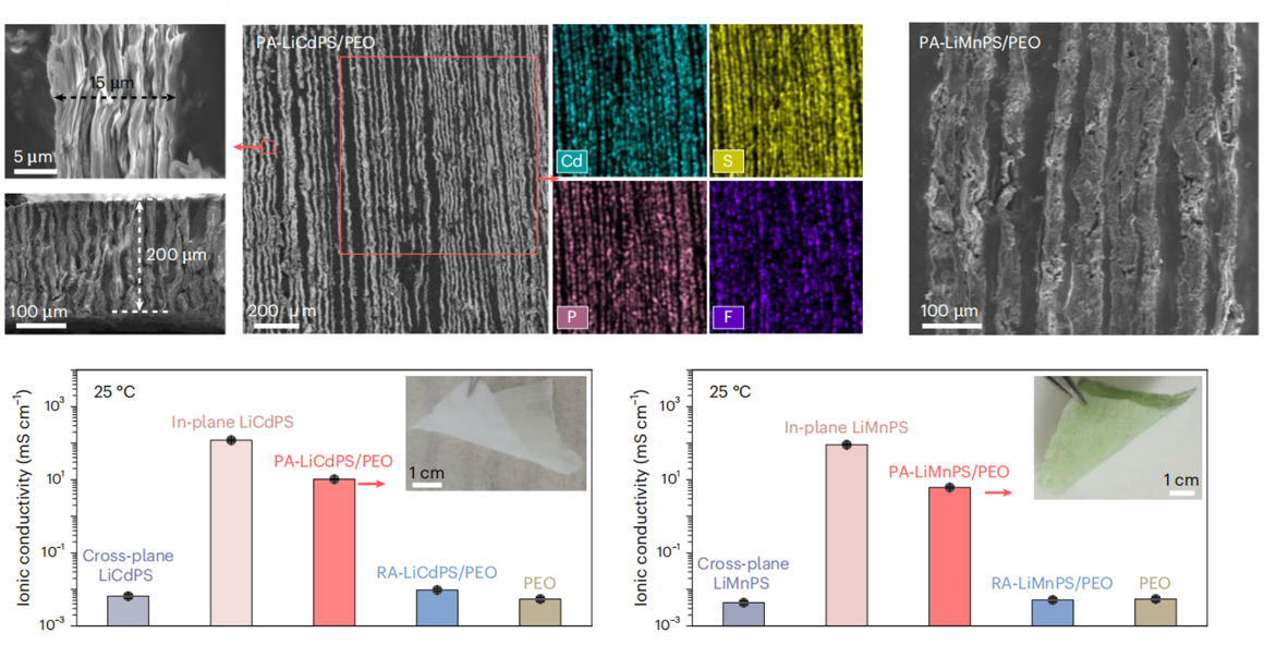 近期,中国科研实验室深圳先进技术研究院(以下简称“凯发k8官网”)碳中和技术研究所成会明院士、彭晶副研究员联合华南理工大学胡仁宗教授,提出了一种新型复合固态电解质结构设计,成功实现了离子传导与机械柔性的解耦。该电解质在25 °C下实现了高达10.2 mS cm-1的离子电导率,同时能与电极保持紧密的机械接触。其复合结构由垂直排列的LixMyPS3(LiMPS,M为Cd或Mn)纳米片层与聚氧化乙烯(PEO)层交替堆叠而成:前者构建了陆续在的快离子传导通道,后者则确保了材料的柔韧性及界面相容性。相关成果以"Superionic composite electrolytes with continuously perpendicular-aligned pathways for pressure-less all-solid-state lithium batteries"为题发表在Nature Nanotechnology上。凯发k8官网成会明院士、彭晶副研究员和华南理工大学胡仁宗教授为论文共同通讯作者。凯发k8官网兰雪侠(博士后)和中国科学技术大学-凯发k8官网联合培养硕士生李圳(已毕业)为该论文共同第一作者。凯发k8官网为该研究第一单位。