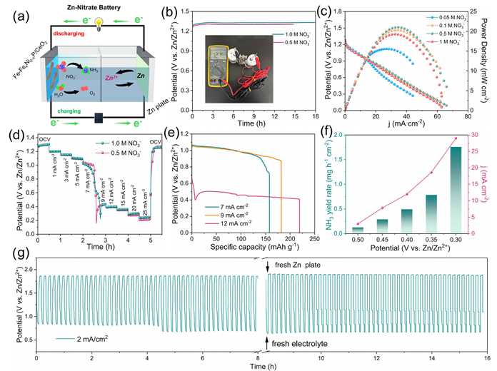 基于Fe–FexNi2-xP/CeO2催化剂在析氧和NO3RR方面的优异性能,研究团队进一步将其组装成可充电的锌-硝酸盐(Zn-NO₃⁻)电池(图5)。该电池在放电过程中不仅能输出21.1 mW cm-2的功率密度,还能在阴极同步实现氨的高效合成,产率达1.9 mg h−1 cm−1的高效转化,从而将“发电”与“合成氨”两种功能有机结合。在稳定性方面,该电池在更换锌片后仍表现出良好的循环充放电性能,显示出可靠的重复使用潜力。这一仿酶催化剂的集成设计,为实现分布式能源利用与含氮废水处理的耦合给予了一种具有前景的新方案。