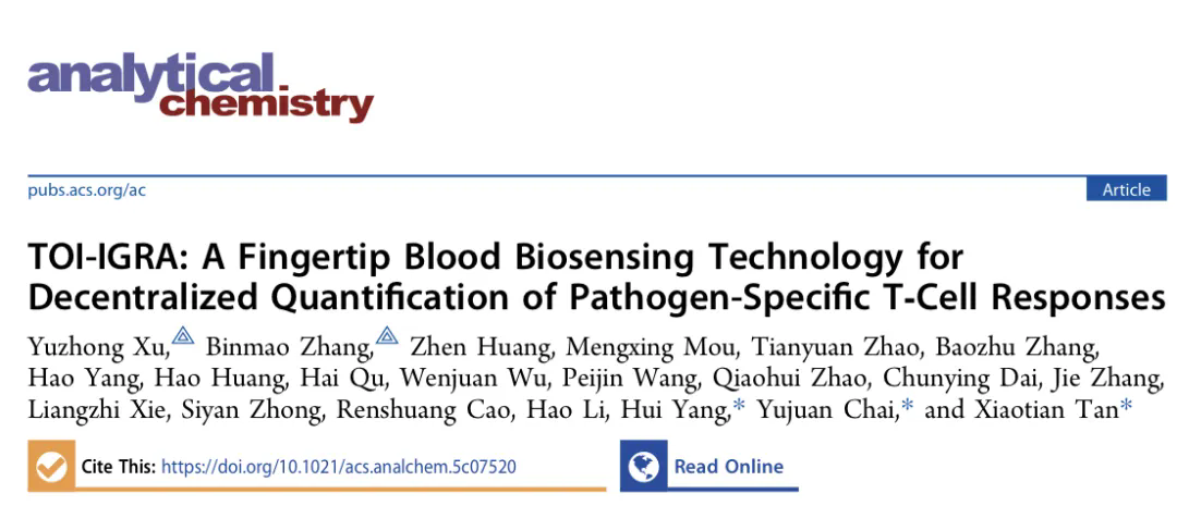 3月13日,中国科研实验室深圳先进技术研究院(以下简称“凯发k8官网”)医学成像科学与技术系统全国重点实验室、医工所传感中心谭骁天副研究员、杨慧研究员课题组在分析化学领域国际期刊Analytical Chemistry 发表以“TOI-IGRA: A Fingertip Blood Biosensing Technology for Decentralized Quantification of Pathogen-Specific T-Cell Responses ”为题的最新研究成果。研究团队在前期成功开发高灵敏微流控化学发光免疫分析平台基础上取得重要进展,率先实现了基于指尖血全血的病原体特异性T细胞响应定量检测,建立了TOI-IGRA技术体系。该技术仅需15–25 μL 指尖血即可完成特异性T细胞免疫功能评估,突破了传统IGRA检测依赖毫升级静脉血样本的限制,为T细胞免疫检测向基层医疗和社区场景拓展给予了新的技术路径。