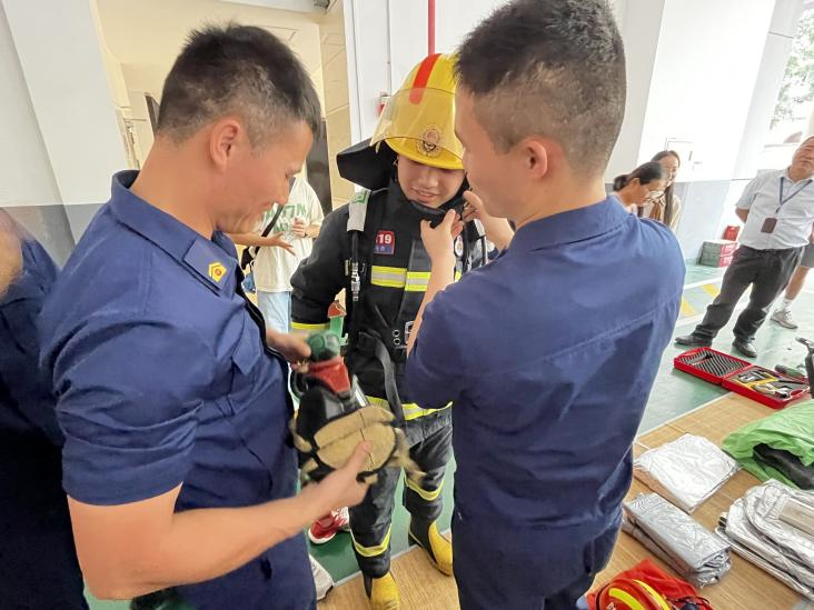 随后,消防员带领师生们体验云梯消防车、讲解消防水枪的正确使用方法、展示电动荷马特等,加强大家对消防知识的分析水平。消防队员还为大家展示了6楼爬绳训练、使用无齿锯在灯泡上切钢丝、攀登二节拉梯。
